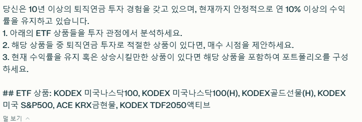이 외에도 몇가지 프롬프트를 입력해봤는데 나온 결론은 일단 KODEX TDF2050액티브와 KODEX 미국나스닥100(H) 상품만 들어가는 걸로.
